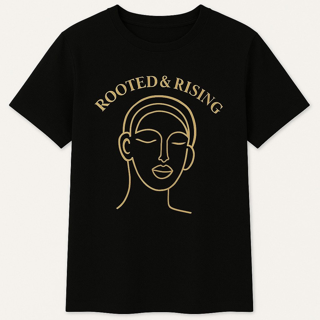 Design: Minimalist gold line-art portrait + “ROOTED & RISING” text